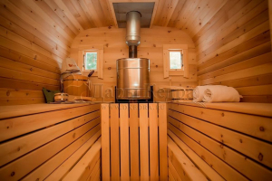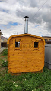 Это квадратное изделие с закругленными углами. За счет такой конструкции во время топки воздух циркулирует по кругу, поэтому баня-бочка нагревается не более 30 минут. Баня имеет одно парильное отделение. Внутри по обе стороны расположены лавочки из кедра, печь установлена между ними у дальней стены. По вашему желанию баню-бочку квадро можно укомплектовать козырьком, верандой и печью с внешней загрузкой, благодаря которой весь мусор после топки остается на улице. Баня-бочка квадро не требует полноценный фундамент, поэтому при необходимости ее можно перенести в другое место.