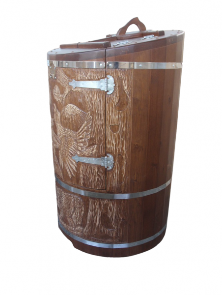 Это горизонтальная фитобочка с эксклюзивным оформлением, покрытием в цвет или резьбой. Индивидуальная модель придаст вашему изделию оригинальный внешний вид. Парение в фитобочке благотворно влияет на организм в целом: повышается иммунитет, выводятся шлаки и токсины, улучшается работа органов тела и состояние кожи. Подходит для коммерции.