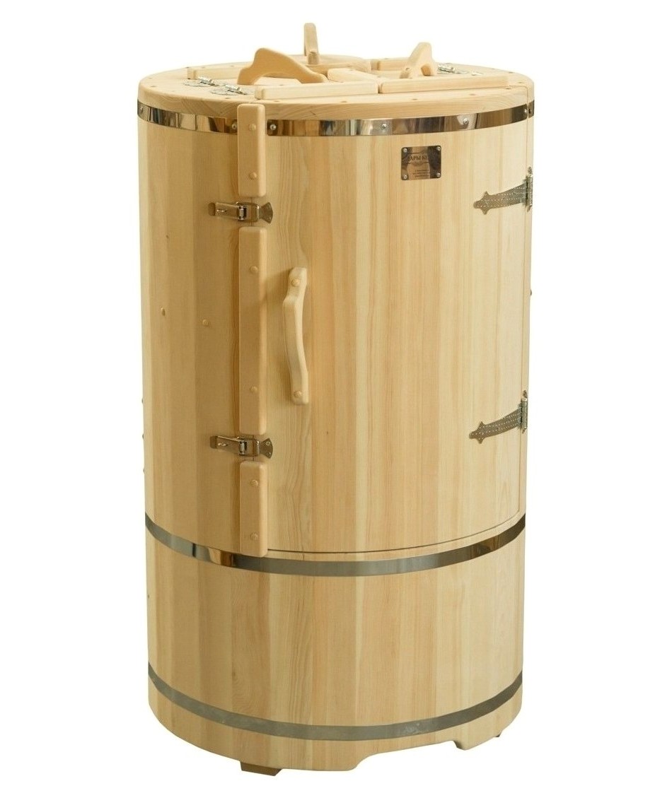 Кедровая бочка (фитобочка) круглая «Профессиональная Богатырская» Это круглая фитобочка из кедра увеличенных размеров с толщиной стенок 45 мм. Подходит для людей высокого роста и крупной комплекции. Фитобочка оборудована откидными створками, дверцей и отверстием для головы. Во время парения человек сидит внутри кедровой бочки, а голова находится снаружи. Благодаря этому исключается возможность перегрева. Подлокотники из кедра, встроенные ручки на створках и двери делают эксплуатацию более удобной. Парение в фитобочке благотворно влияет на организм в целом: повышается иммунитет, выводятся шлаки и токсины, улучшается работа органов тела и состояние кожи.