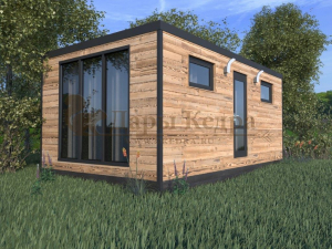 Это утепленный домик прямоугольной формы с панорамным окном и двумя помещениями: жилой комнатой и санузлом с душевой зоной. Может быть изготовлен по готовым стандартам или вашим индивидуальным размерам. Современные материалы, используемые при проектировании, отличаются экологичностью и прочностью.