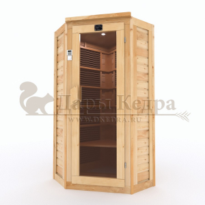 Это специально оборудованная кедровая кабина для прогрева тела человека сухим теплом. Воздух в таких парных не нагревается. Инфракрасные лучи воздействуют на тело, равномерно прогревая мышцы, суставы и органы. Карбоновые излучатели, встроенные в стены кабины, обладают мягким прогревом, что полностью исключает возможность ожога. Работает кабина за счет электричества. Установка сауны в угол, позволяет рационально использовать пространство помещения. Подходит как для домашнего использования, так и для коммерции.
