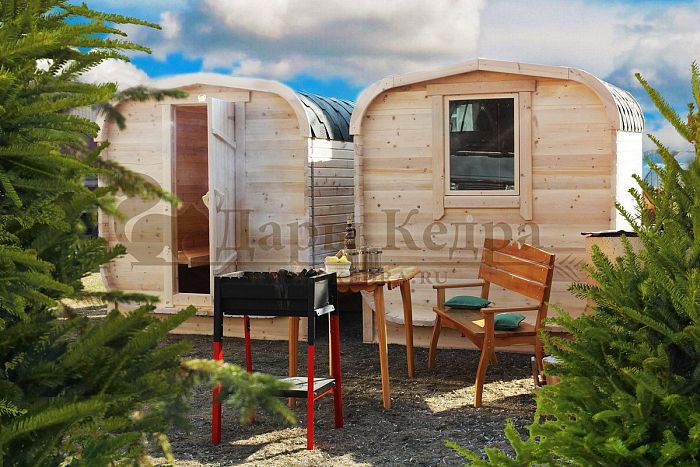 Оригинальное строение в виде бани-бочки, казалось бы, вообще не вариант для обустройства под дом. Но покажем наглядно, какими элементами можно дополнить раздевалку, чтобы баня в виде вагончика функционалом ничем не отличалась от летнего домика. Откидные столики, полочки, коврики, лежанки, зеркала и многое другое создадут уют, стены из кедра добавят тепла и оригинального древесного аромата. Кроме того, если парная выполнена в форме буханки, тут открываются необъятные просторы для дизайна и зонирования комнат для отдыха, спа-процедур. Ведь сама по себе такая форма бани предполагает увеличение пространства за счет ровного пола и увеличенной высоты потолков до 2,3 метра. На примерах уже завершенных проектов можно почерпнуть для себя идеи, добавить что-то свое и получится вполне оригинальный, комфортный дом для проживания летом. Если конструкцию утеплить на стадии строительства, то в таком домике можно проводить даже зимние вечера. Также стоит отметить, что такой дом-баня из кедра отличается не только функционалом, но и своей пользой за счет лечебной древесины кедра.