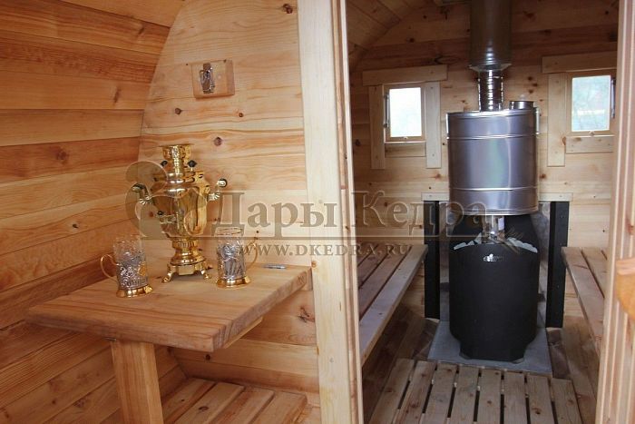 Баня-бочка представляет собой конструкцию в виде бочонка без углов. Такая форма считается оптимальной для равномерного распределения пара по всей внутренней поверхности парной. Таким образом, пар не скапливается в одном месте, а циркулирует по всему объему. Соответственно, круглая (квадратная, овальная) баня экономичная: топится быстро, требует дров мало. Приведем пример: чтобы классическая парилка прогрелась до 90С, и вода в баке стала горячей, потребуется около 8-и часов; для круглой парной это время сокращается 3 раза. Чтобы в бане-бочке была температура 80-90С достаточно всего 40 минут, остальное время (около 1,5-2 часов) потребуется на разогрев воды в баке. За такие показатели банные конструкции в виде бочки стали очень популярными в последнее время среди россиян и жителей заграницы.