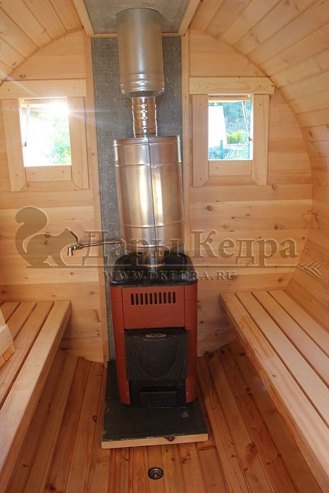Банная конструкция в виде бочки не должна разогреваться выше 110С. Если это все-таки произошло, то тушить дрова в печи не надо, просто стоит открыть двери и проветрить все отделения бани.