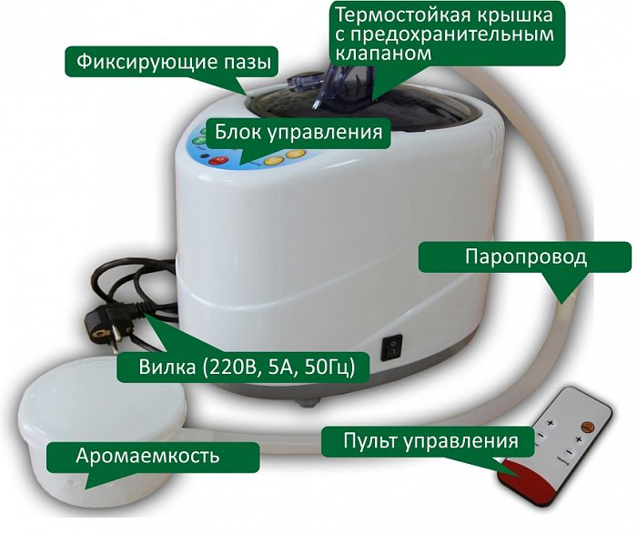 - Для работы устройства выработки пара помещение должно быть оборудовано розеткой (220В, 5А, 50 Гц).