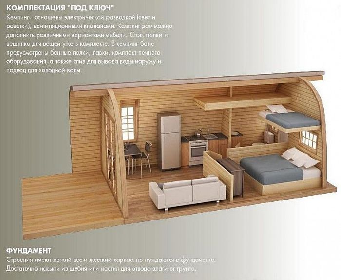 Чтобы установить кемпинг-домик по месту его размещения, достаточно заранее подготовить выровненную площадку. Кемпинг является облегченной версией дома, поэтому не требует полноценного фундамента, достаточно выложить тротуарную плитку или сделать насыпную площадку, установив обвязку брусом 150 мм. Главное условие - это воздухообмен между дном глэмпингом и площадкой. Нельзя устанавливать конструкцию на траву, неровную площадку. Потребуется организовать слив, если в доме имеется сан.узел или душевая кабина. Самым распространенным фундаментом для глэмпинга является каркасный фундамент с обшивкой террасной доской, смотрится стильно, дополняет конструкцию эко-дома.