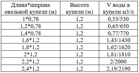 При ширине изделия 0,78 м заполняемость будет около 0,5-1 тонны. Вместимость небольшой купели - 1-2 человека. При длине изделия от 1,6 м вместимость составит 2-4 человека.